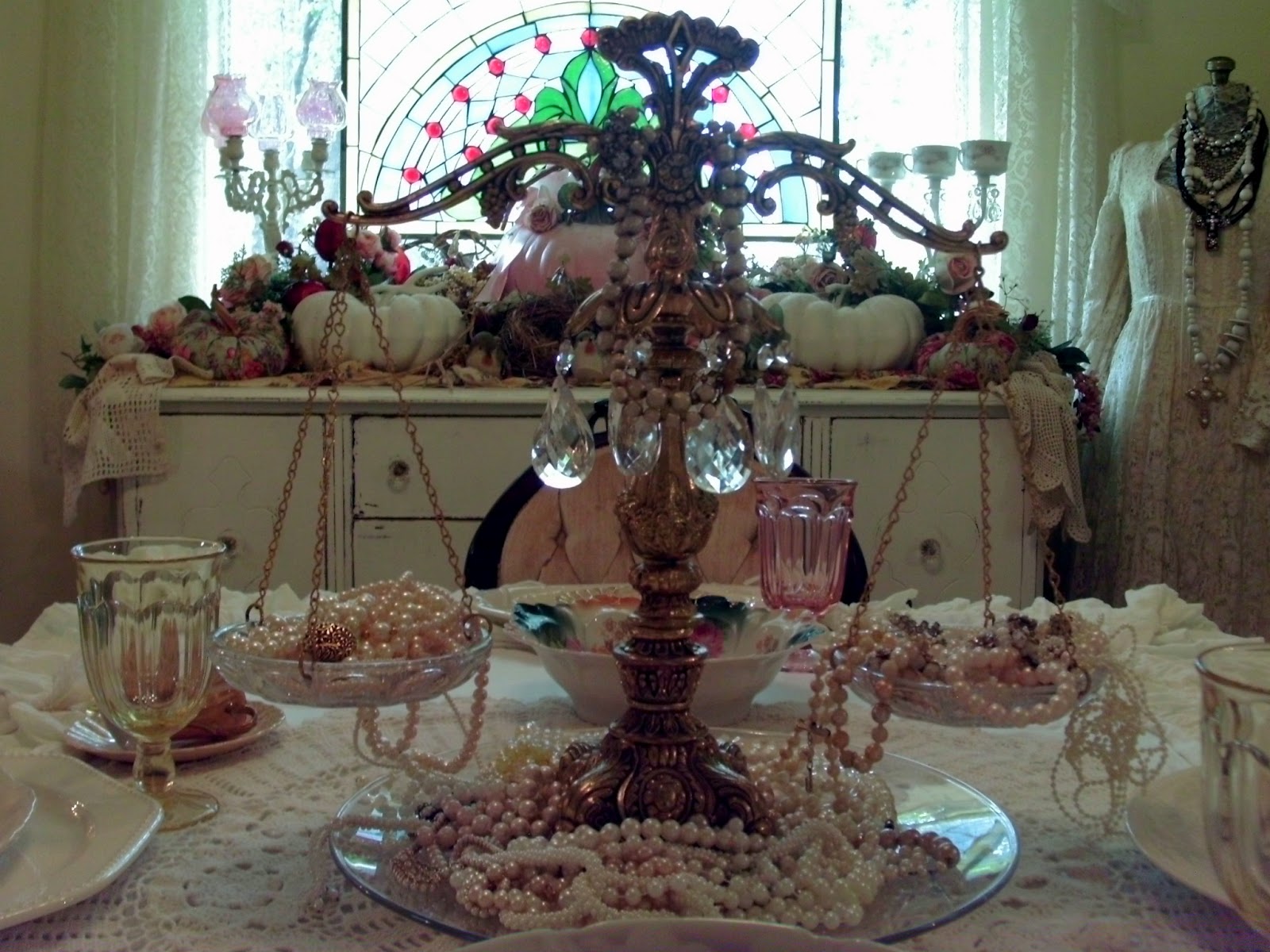 Usually these vintage scales are filled with grapes and fruit, but I chose pearls and diamonds for my romantic fall dinner. |