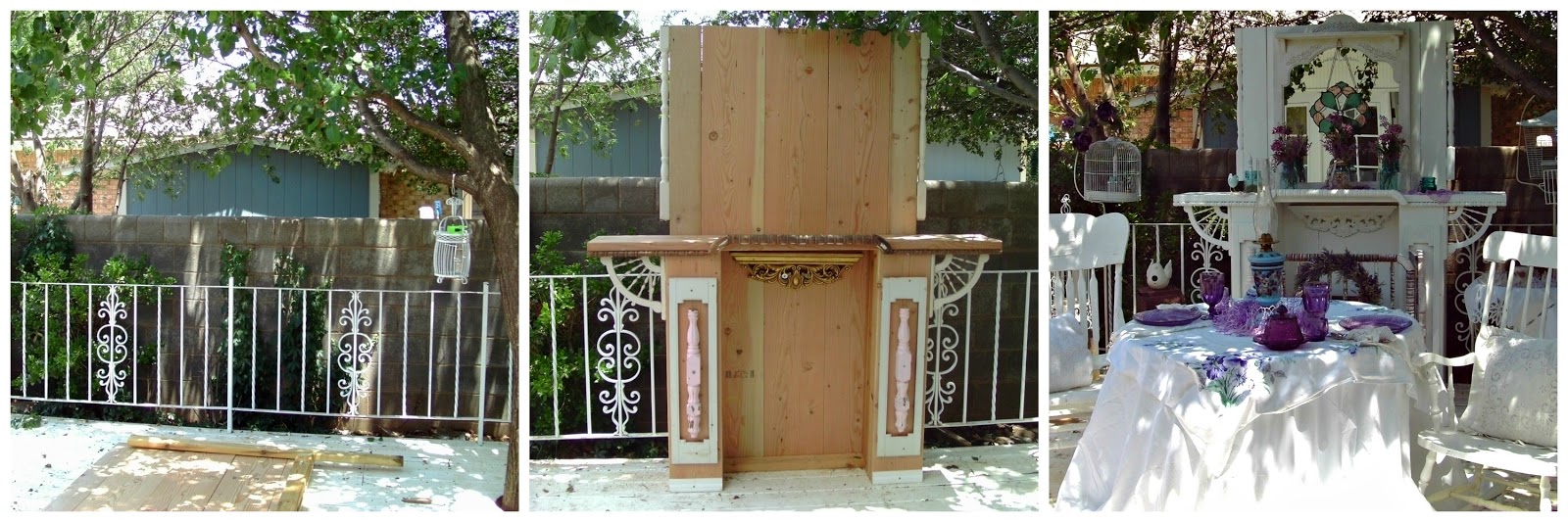 Here are some before, during, and after pictures.   The back of the fireplace is constructed from three 2x12x7'  and two 2x6x7'.($60 at Lowes)  The mantle is a 2x12x6' ($6)  The columns are 2x10x42" (auction $5) The white frames on the columns are shutters and the pink piece in the middle of them is a piece of rocking chair leg.  The victorian corner pieces on the sides of the mantle are some I bought at a yard sale for $2  The piece under the mantle is a $4 yard sale shelf.  The mirror was $5 at a yard sale.   So, with screws, paint, and lumber...the total project was less than $100.