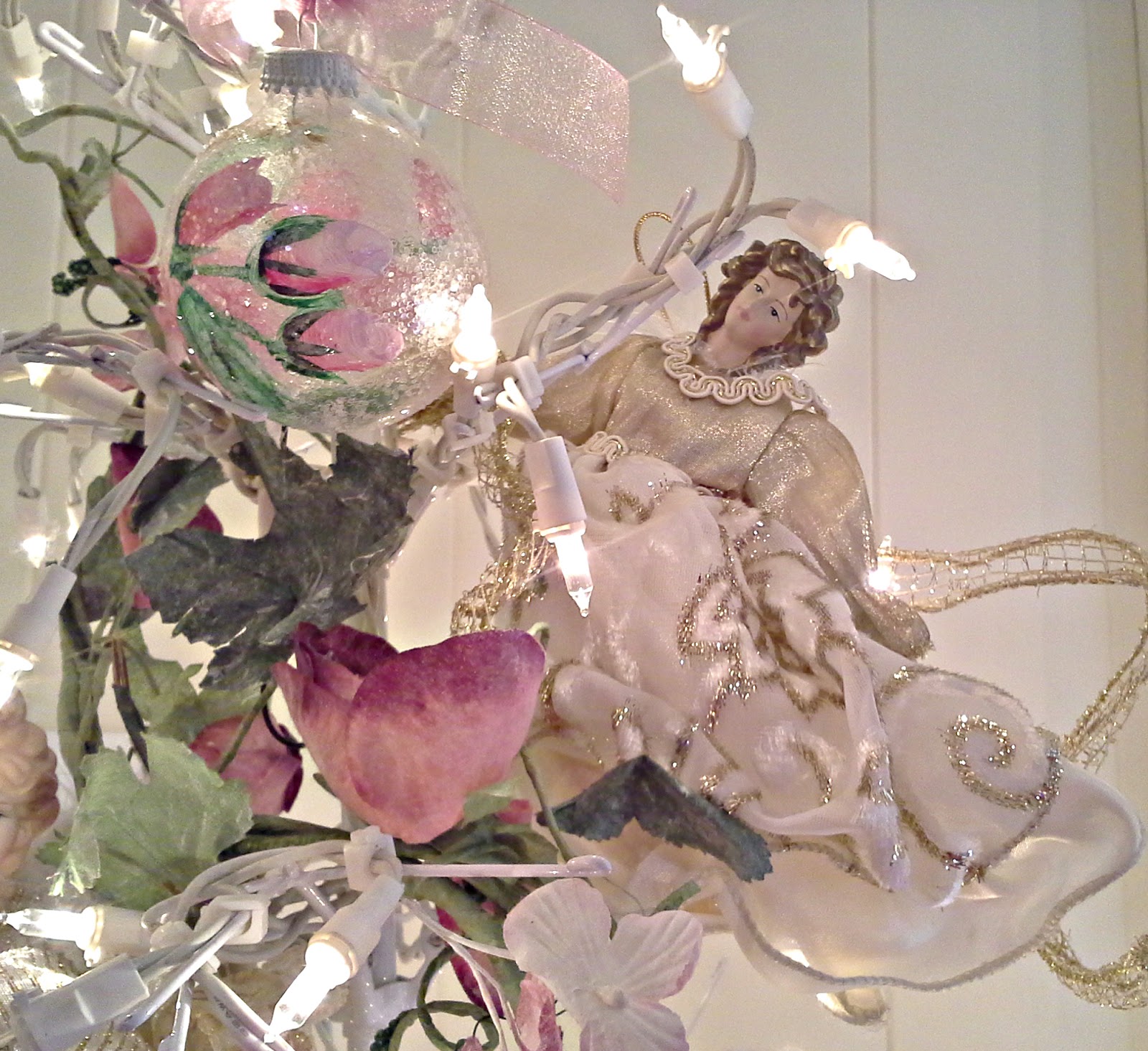 | So, I filled my tree with angles and a few clear Christmas balls that are hand painted with roses |