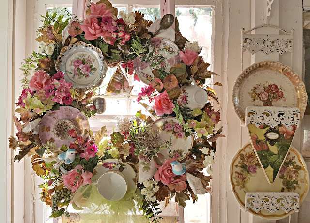 I made this wreath from odds and ends cups and saucers. I have a short tutorial on how I made it....here's a link to that post.... http://penny-pennystreasures.blogspot.com/2015/03/how-to-make-china-tea-cup-wreath.html |