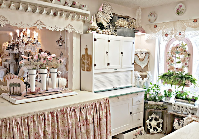 I love to create pretty tablescapes, so I have to find places to stash all the dishes I have. Let's take a look under the drape across the pass thru......... |