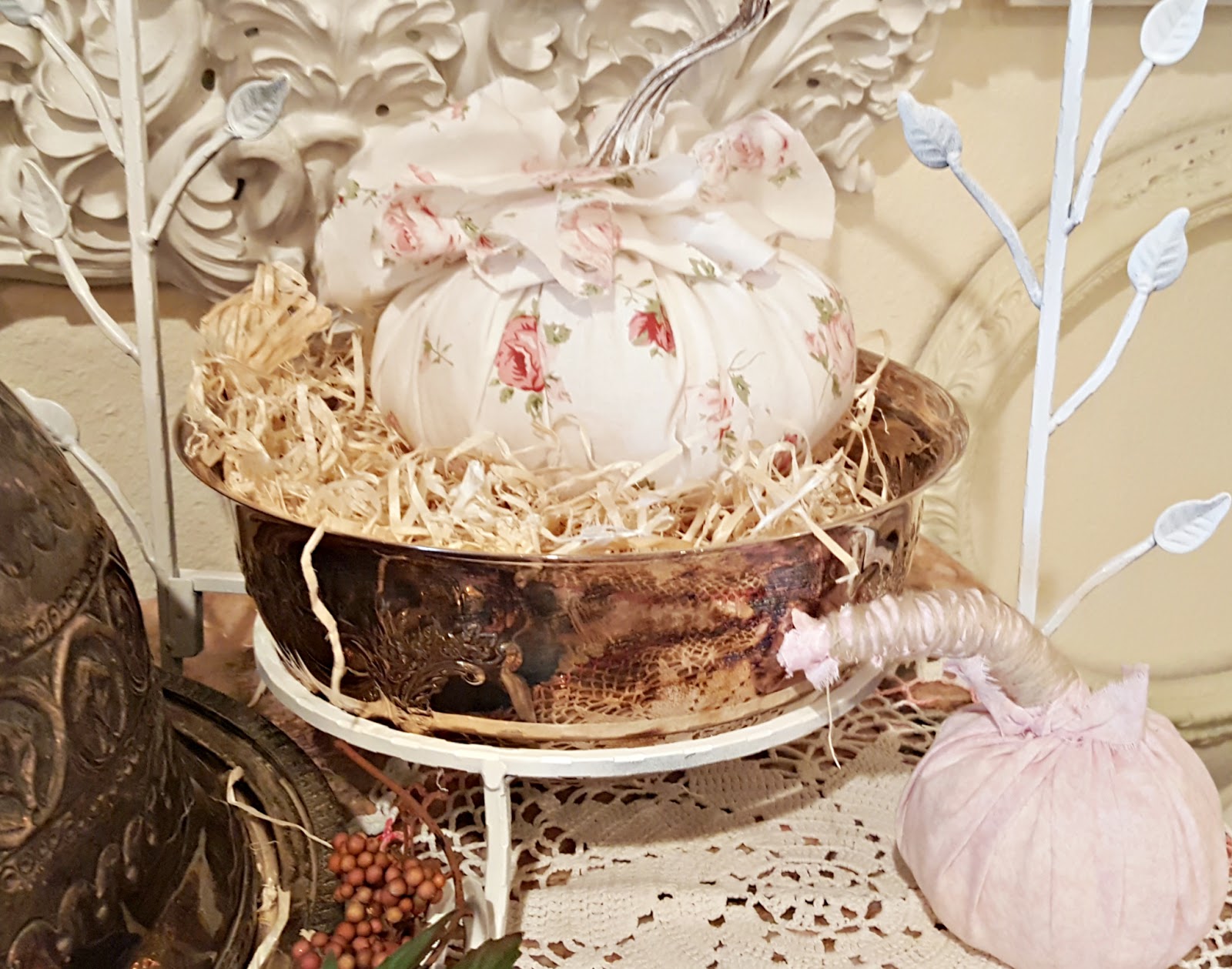 I have these two little fabric pumpkins on a silver platter in a nest of dried rose petals. |