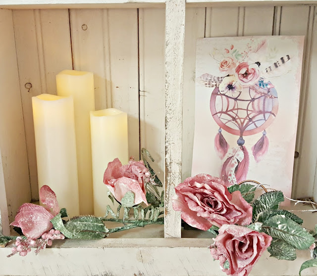 Then I clipped some roses to the top of the garland. I found these roses at At Home on clearance several years ago and they are so versatile.......wish they still had them, I would pick up some more. |