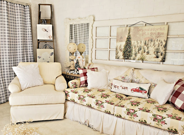 Whether you call it a sun room or a sittin' porch.....H & I spend a lot of time out here. I've been getting it all decked out for Christmas and I'm about 2/3's of the way done. I was careful not to share a pic of my undecorated tree in the corner, but I should be back soon with a tour of the entire room decorated for Christmas. |