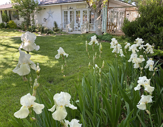 The bed of White Iris are near the back porch,   so I get to enjoy them from the comfort of a cozy chair on the porch...lol!